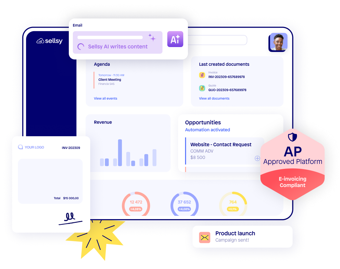 With Sellsy, manage your sales, e-invoicing, marketing and cash flow on a single interface, and optimize your actions with AI to focus on what's most important: your customers.